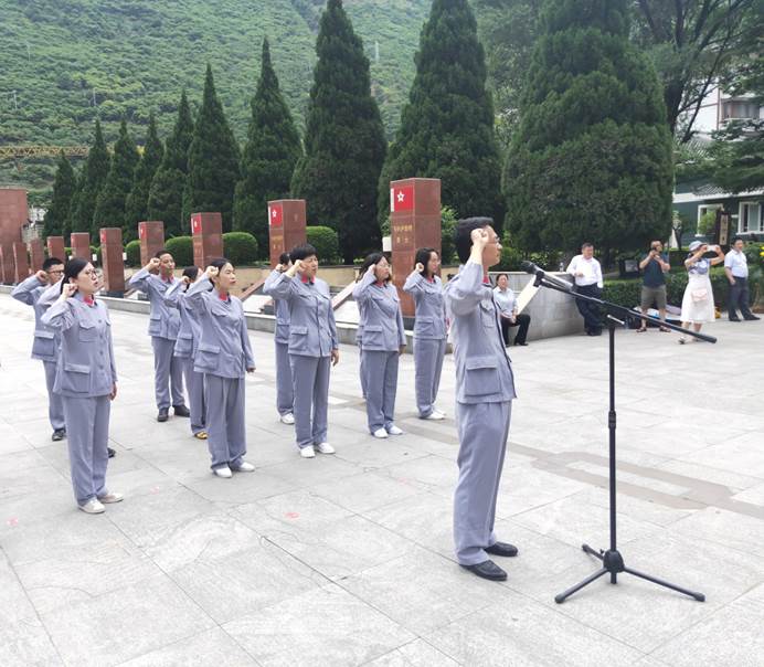 在红军飞夺泸定桥纪念碑前,党员同志们肃穆而立,鞠躬默哀,敬献花篮,倾诉哀思,深切缅怀革命先烈的丰功伟绩。祭奠仪式之后,胡迅带领大家,举起右拳,面对党旗,庄严地重温入党誓词,掷地有声的“我志愿加入中国共产党”回荡在陵园的苍松翠柏间,不仅告慰烈士的英灵,同时也是又一次庄严承诺,涤荡心灵。