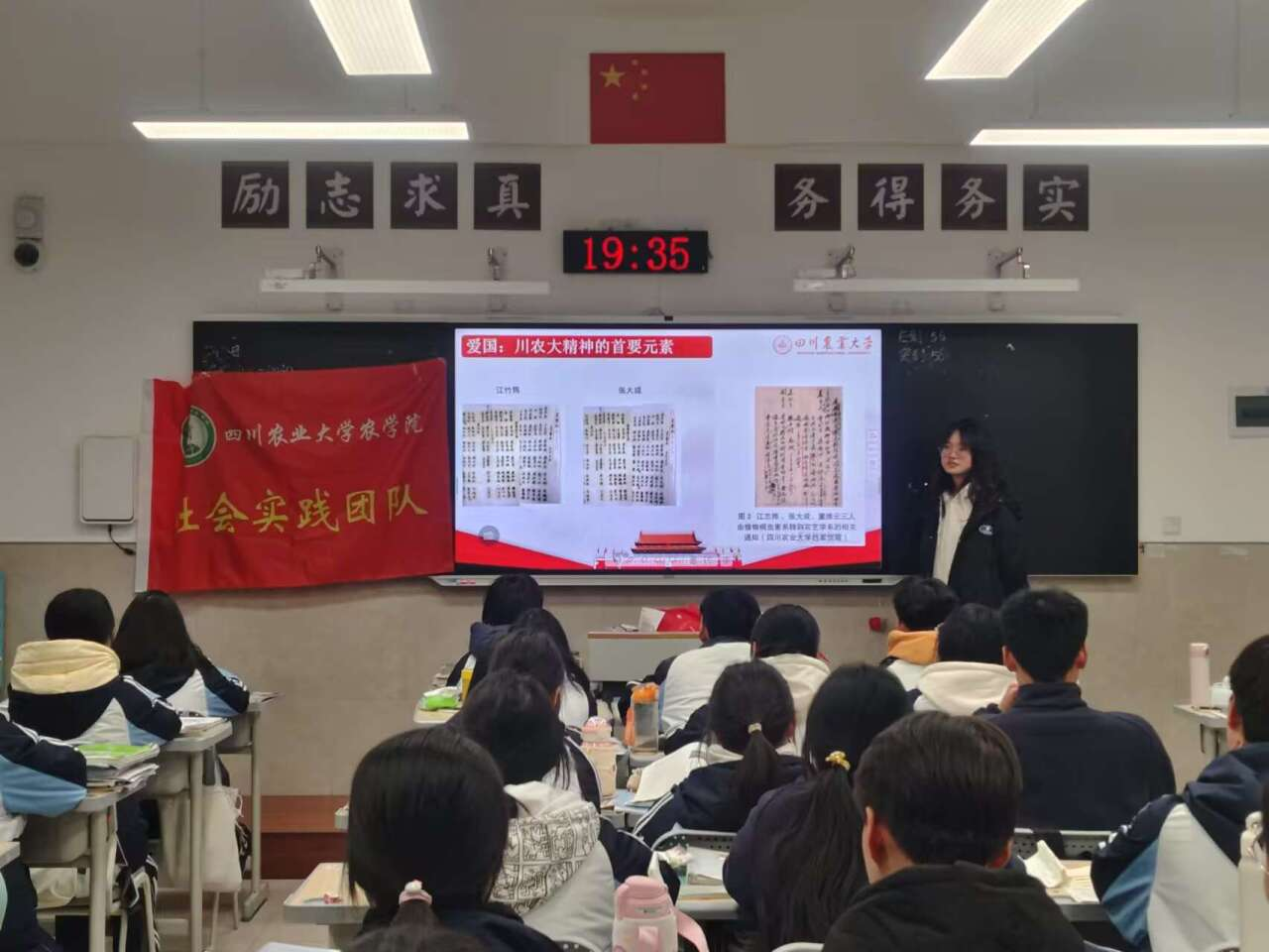 在活动开展初期,团队邀请第11期青马班成员、右木理论宣讲团成员、马克思主义学院23级研究生夏唯洋开展线上红色宣讲。此次宣讲以川农大精神中的“爱国”为关键词,讲述了川农的红色基因,特别强调了江姐在抗战时期的成长与革命经历以及宁死不屈的英雄气概。该宣讲不仅为实践团队后续活动的展开提供了重要的知识基础,还提高了团队成员的思想觉悟。