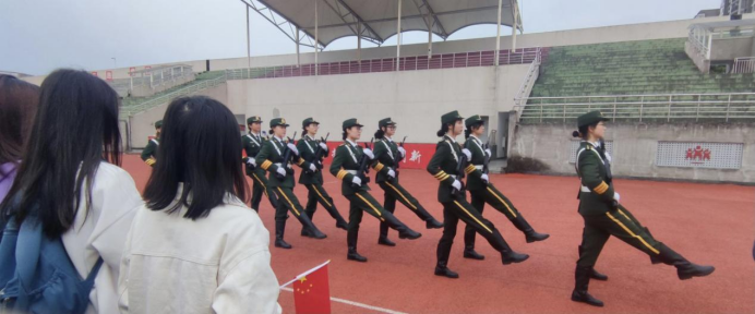 图为同学们观看国旗护卫队的升旗仪式