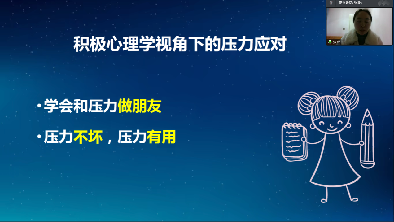 为提高当代大学生心理素质、有效释放压力,12月9日,开云手机版登录入口特邀学校心理健康教育中心专职老师、国家二级心理咨询师张玲为同学们带来“积极心理学视角下的压力应对”主题线上讲座。党委办公室副主任沈丽淘主持活动。