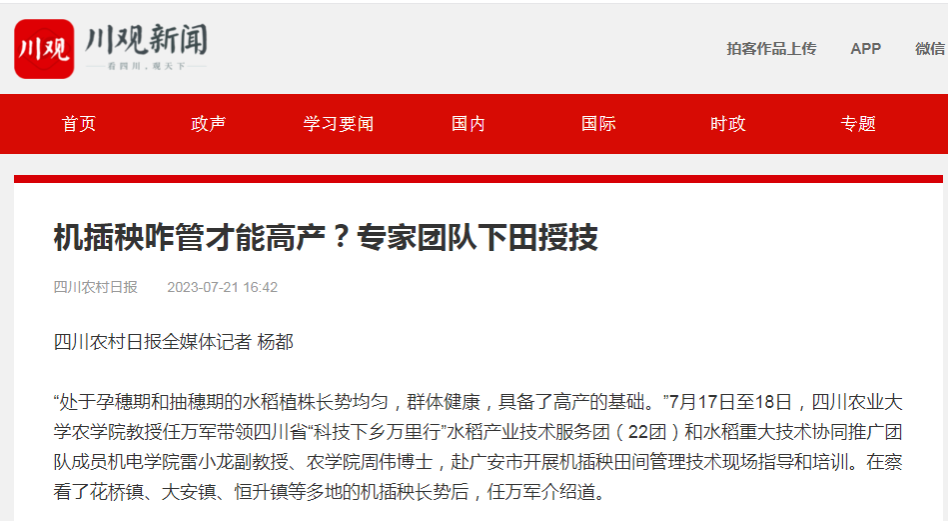 “今年机插栽培在广安市发展非常迅速,大户对机插种植水稻的评价非常高。”广安市农技站站长秦玉霞介绍,任万军教授团队在广安市推广示范的机插秧高产高效栽培技术,让种植大户实实在在感受到节本增效高产的变化。下一步,广安市将会进一步加大对机插秧技术的推广力度。